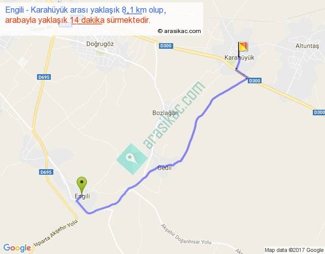 Engili - Karahüyük arası yaklaşık olarak 90 km/h ile yukarıda belirtilen sürede olup, iki yerin kuş uçuşu uzaklığı (mesafesi) 6'dir. Yolculuk otobüsle 18 dakika sürmektedir.