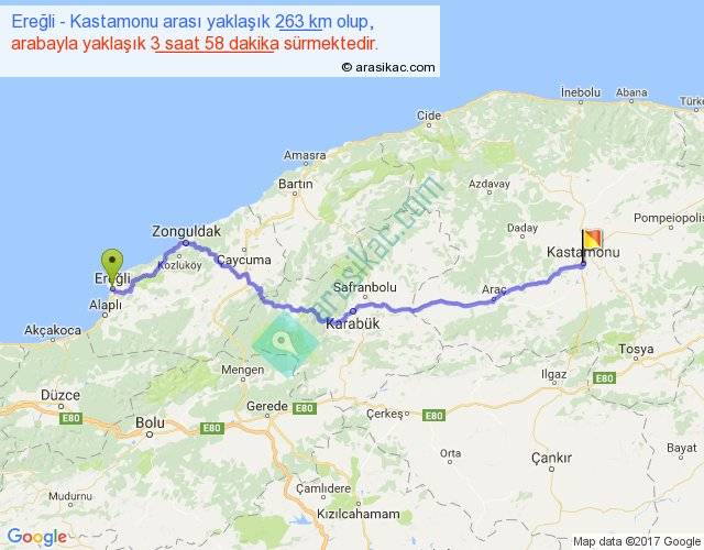Ereğli - Kastamonu arası yaklaşık olarak 90 km/h ile yukarıda belirtilen sürede olup, iki yerin kuş uçuşu uzaklığı (mesafesi) 196'dir. Yolculuk otobüsle 5 saat 9 dakika sürmektedir.