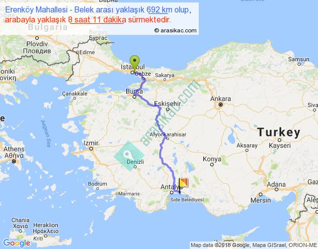 Erenköy Mahallesi - Belek arası yaklaşık olarak 90 km/h ile yukarıda belirtilen sürede olup, iki yerin kuş uçuşu uzaklığı (mesafesi) 485'dir. Eğer belirtilen yerler arasında uçak seferi var ise bu süre uçakla 44 dakika'ya kadar düşebilir. Yolculuk otobüsle 10 saat 38 dakika sürmektedir.
