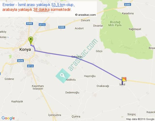 Erenler - İsmil arası yaklaşık olarak 90 km/h ile yukarıda belirtilen sürede olup, iki yerin kuş uçuşu uzaklığı (mesafesi) 49'dir. Yolculuk otobüsle 49 dakika sürmektedir.