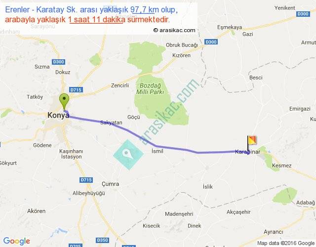 Erenler - Karatay Sk. arası yaklaşık olarak 90 km/h ile yukarıda belirtilen sürede olup, iki yerin kuş uçuşu uzaklığı (mesafesi) 92'dir. Yolculuk otobüsle 1 saat 32 dakika sürmektedir.