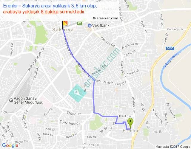 Erenler - Sakarya arası yaklaşık olarak 90 km/h ile yukarıda belirtilen sürede olup, iki yerin kuş uçuşu uzaklığı (mesafesi) 3'dir. Yolculuk otobüsle 10 dakika sürmektedir.