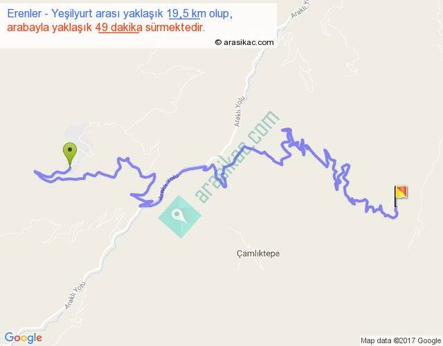 Erenler - Yeşilyurt arası yaklaşık olarak 90 km/h ile yukarıda belirtilen sürede olup, iki yerin kuş uçuşu uzaklığı (mesafesi) 7'dir. Yolculuk otobüsle 1 saat 3 dakika sürmektedir.