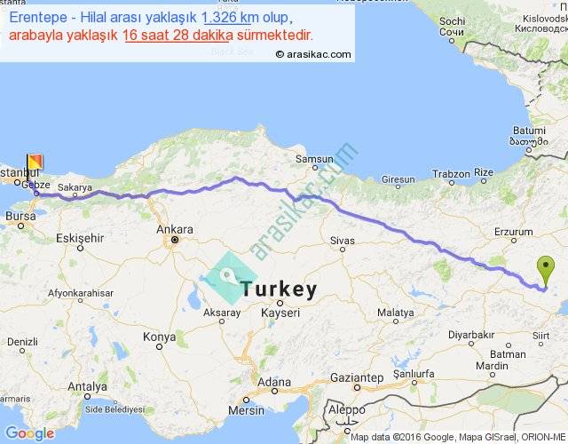 Erentepe - Hilal arası yaklaşık olarak 90 km/h ile yukarıda belirtilen sürede olup, iki yerin kuş uçuşu uzaklığı (mesafesi) 1105'dir. Eğer belirtilen yerler arasında uçak seferi var ise bu süre uçakla 1 saat 42 dakika'ya kadar düşebilir. Yolculuk otobüsle 21 saat 24 dakika sürmektedir.
