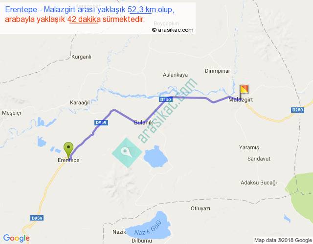 Erentepe - Malazgirt arası yaklaşık olarak 90 km/h ile yukarıda belirtilen sürede olup, iki yerin kuş uçuşu uzaklığı (mesafesi) 44'dir. Yolculuk otobüsle 54 dakika sürmektedir.