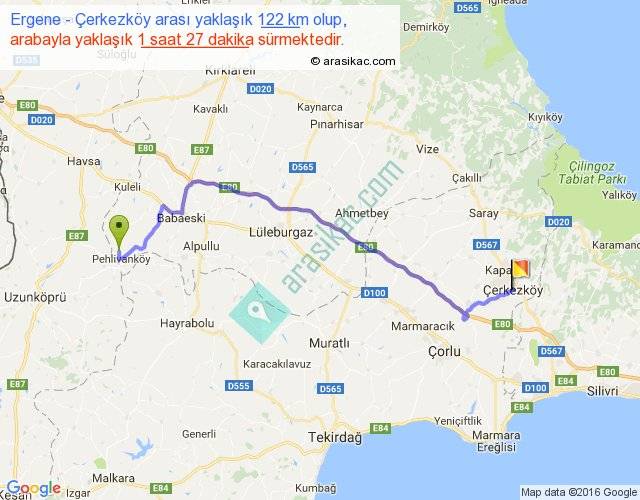 Ergene - Çerkezköy arası yaklaşık olarak 90 km/h ile yukarıda belirtilen sürede olup, iki yerin kuş uçuşu uzaklığı (mesafesi) 90'dir. Yolculuk otobüsle 1 saat 53 dakika sürmektedir.