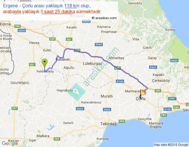 Ergene - Çorlu arası yaklaşık olarak 90 km/h ile yukarıda belirtilen sürede olup, iki yerin kuş uçuşu uzaklığı (mesafesi) 78'dir. Yolculuk otobüsle 1 saat 50 dakika sürmektedir.