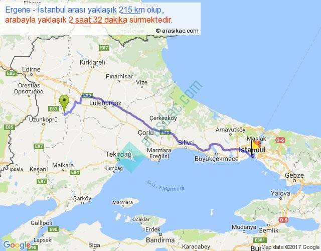 Ergene - İstanbul arası yaklaşık olarak 90 km/h ile yukarıda belirtilen sürede olup, iki yerin kuş uçuşu uzaklığı (mesafesi) 176'dir. Yolculuk otobüsle 3 saat 17 dakika sürmektedir.