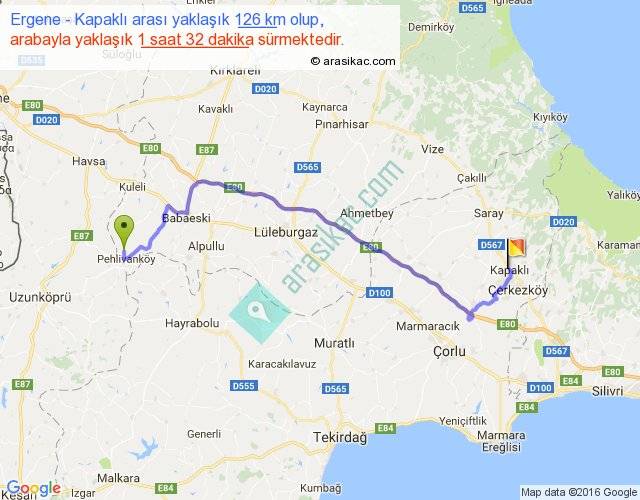 Ergene - Kapaklı arası yaklaşık olarak 90 km/h ile yukarıda belirtilen sürede olup, iki yerin kuş uçuşu uzaklığı (mesafesi) 88'dir. Yolculuk otobüsle 1 saat 59 dakika sürmektedir.