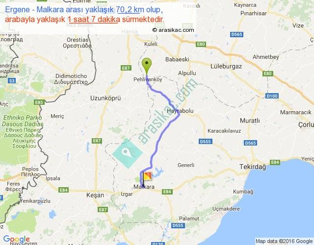 Ergene - Malkara arası yaklaşık olarak 90 km/h ile yukarıda belirtilen sürede olup, iki yerin kuş uçuşu uzaklığı (mesafesi) 52'dir. Yolculuk otobüsle 1 saat 27 dakika sürmektedir.