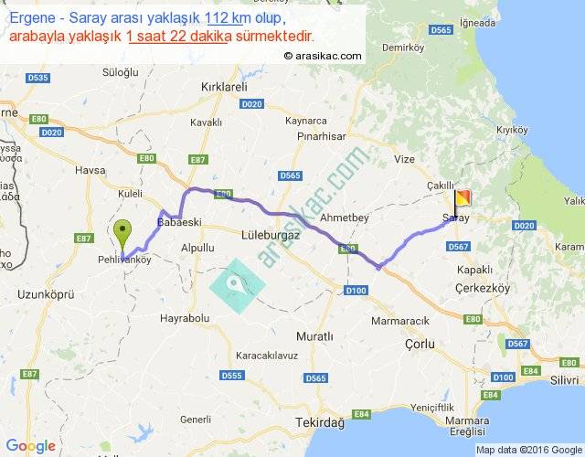 Ergene - Saray arası yaklaşık olarak 90 km/h ile yukarıda belirtilen sürede olup, iki yerin kuş uçuşu uzaklığı (mesafesi) 84'dir. Yolculuk otobüsle 1 saat 46 dakika sürmektedir.