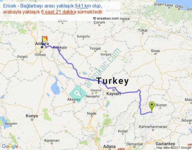 Ericek - Bağlarbaşı arası yaklaşık olarak 90 km/h ile yukarıda belirtilen sürede olup, iki yerin kuş uçuşu uzaklığı (mesafesi) 403'dir. Eğer belirtilen yerler arasında uçak seferi var ise bu süre uçakla 37 dakika'ya kadar düşebilir. Yolculuk otobüsle 8 saat 15 dakika sürmektedir.