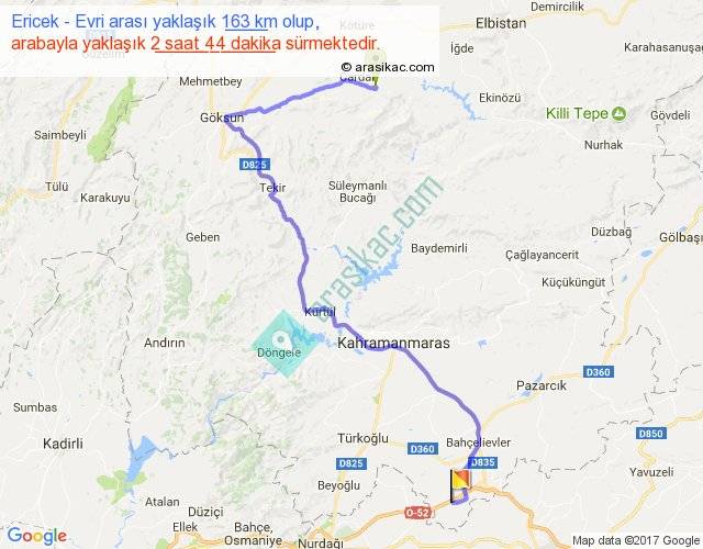 Ericek - Evri arası yaklaşık olarak 90 km/h ile yukarıda belirtilen sürede olup, iki yerin kuş uçuşu uzaklığı (mesafesi) 92'dir. Yolculuk otobüsle 3 saat 33 dakika sürmektedir.