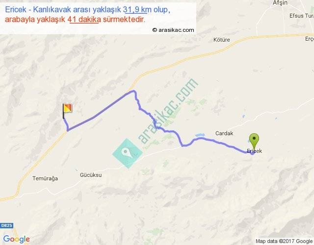 Ericek - Kanlıkavak arası yaklaşık olarak 90 km/h ile yukarıda belirtilen sürede olup, iki yerin kuş uçuşu uzaklığı (mesafesi) 24'dir. Yolculuk otobüsle 53 dakika sürmektedir.