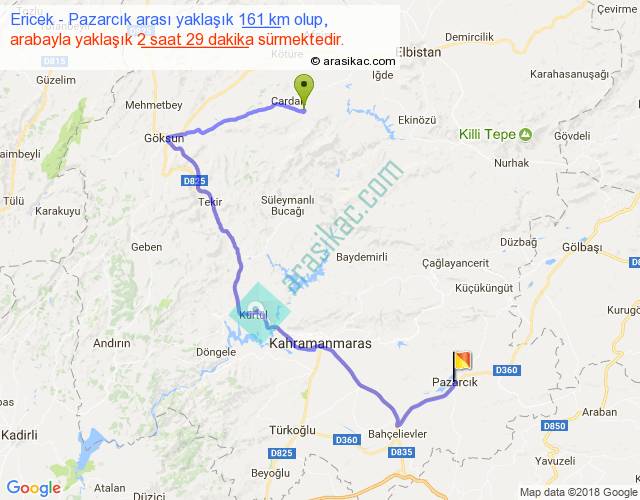 Ericek - Pazarcık arası yaklaşık olarak 90 km/h ile yukarıda belirtilen sürede olup, iki yerin kuş uçuşu uzaklığı (mesafesi) 75'dir. Yolculuk otobüsle 3 saat 13 dakika sürmektedir.