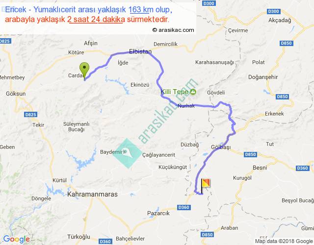 Ericek - Yumaklıcerit arası yaklaşık olarak 90 km/h ile yukarıda belirtilen sürede olup, iki yerin kuş uçuşu uzaklığı (mesafesi) 80'dir. Yolculuk otobüsle 3 saat 7 dakika sürmektedir.