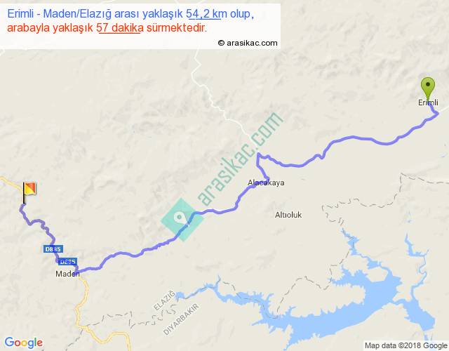 Erimli - Maden Elazığ arası yaklaşık olarak 90 km/h ile yukarıda belirtilen sürede olup, iki yerin kuş uçuşu uzaklığı (mesafesi) 35'dir. Yolculuk otobüsle 1 saat 14 dakika sürmektedir.