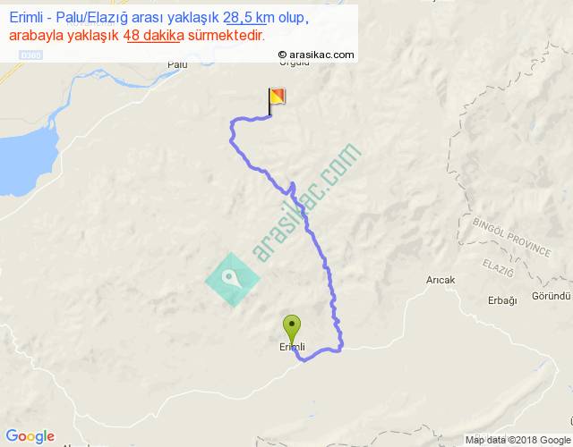 Erimli - Palu Elazığ arası yaklaşık olarak 90 km/h ile yukarıda belirtilen sürede olup, iki yerin kuş uçuşu uzaklığı (mesafesi) 15'dir. Yolculuk otobüsle 1 saat 2 dakika sürmektedir.