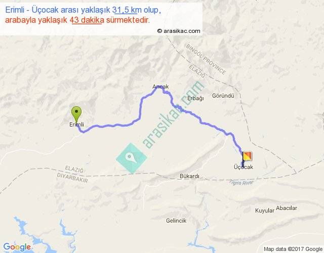 Erimli - Üçocak arası yaklaşık olarak 90 km/h ile yukarıda belirtilen sürede olup, iki yerin kuş uçuşu uzaklığı (mesafesi) 20'dir. Yolculuk otobüsle 55 dakika sürmektedir.