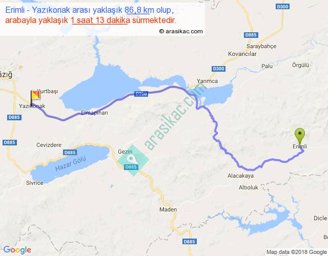 Erimli - Yazıkonak arası yaklaşık olarak 90 km/h ile yukarıda belirtilen sürede olup, iki yerin kuş uçuşu uzaklığı (mesafesi) 63'dir. Yolculuk otobüsle 1 saat 34 dakika sürmektedir.
