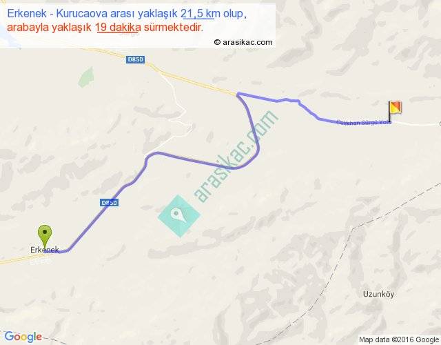 Erkenek - Kurucaova arası yaklaşık olarak 90 km/h ile yukarıda belirtilen sürede olup, iki yerin kuş uçuşu uzaklığı (mesafesi) 16'dir. Yolculuk otobüsle 24 dakika sürmektedir.