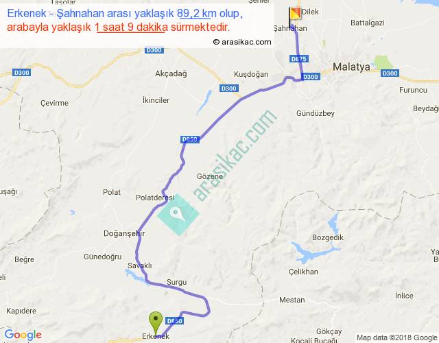 Erkenek - Şahnahan arası yaklaşık olarak 90 km/h ile yukarıda belirtilen sürede olup, iki yerin kuş uçuşu uzaklığı (mesafesi) 58'dir. Yolculuk otobüsle 1 saat 29 dakika sürmektedir.