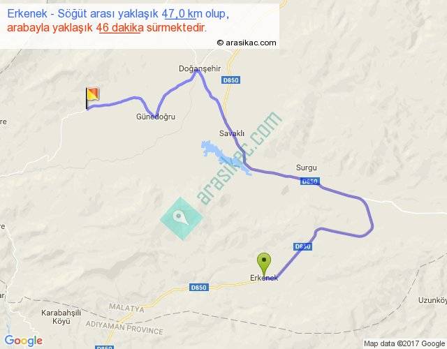 Erkenek - Söğüt arası yaklaşık olarak 90 km/h ile yukarıda belirtilen sürede olup, iki yerin kuş uçuşu uzaklığı (mesafesi) 21'dir. Yolculuk otobüsle 59 dakika sürmektedir.
