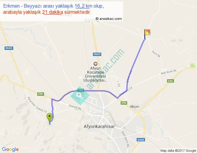 Erkmen - Beyyazı arası yaklaşık olarak 90 km/h ile yukarıda belirtilen sürede olup, iki yerin kuş uçuşu uzaklığı (mesafesi) 12'dir. Yolculuk otobüsle 27 dakika sürmektedir.