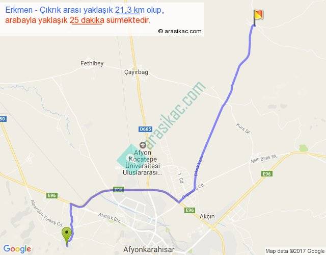 Erkmen - Çıkrık arası yaklaşık olarak 90 km/h ile yukarıda belirtilen sürede olup, iki yerin kuş uçuşu uzaklığı (mesafesi) 17'dir. Yolculuk otobüsle 32 dakika sürmektedir.