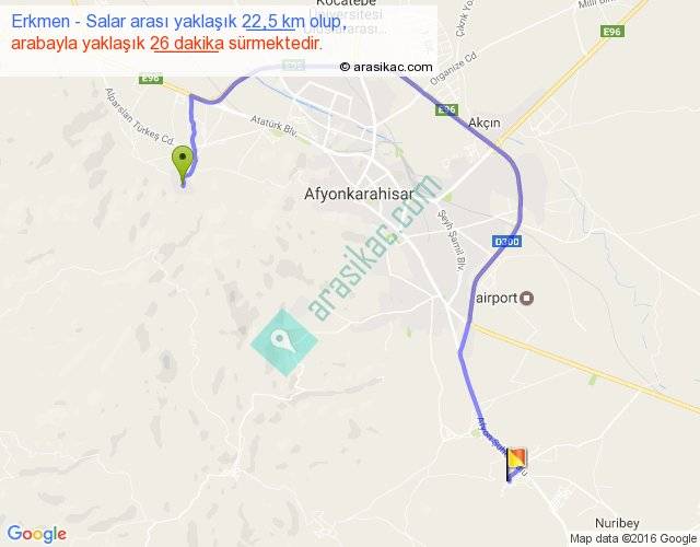 Erkmen - Salar arası yaklaşık olarak 90 km/h ile yukarıda belirtilen sürede olup, iki yerin kuş uçuşu uzaklığı (mesafesi) 12'dir. Yolculuk otobüsle 33 dakika sürmektedir.