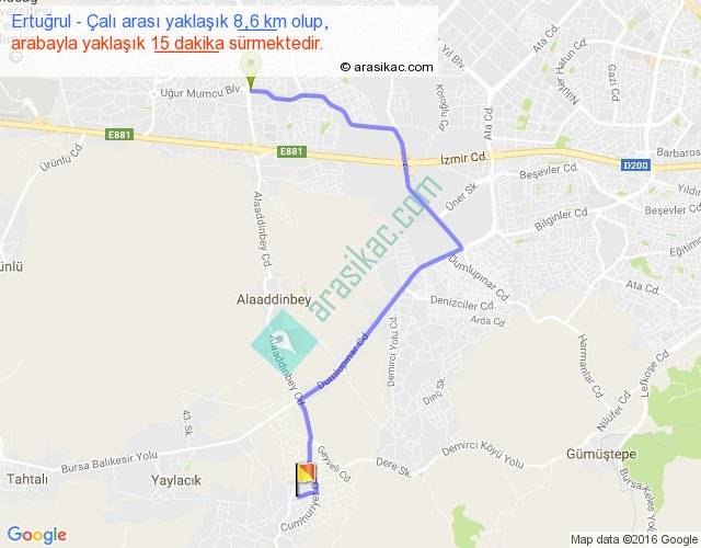 Ertuğrul - Çalı arası yaklaşık olarak 90 km/h ile yukarıda belirtilen sürede olup, iki yerin kuş uçuşu uzaklığı (mesafesi) 5'dir. Yolculuk otobüsle 19 dakika sürmektedir.