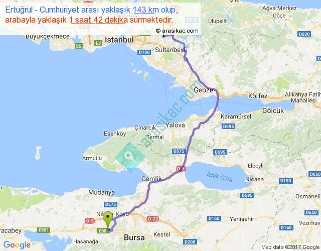 Ertuğrul - Cumhuriyet arası yaklaşık olarak 90 km/h ile yukarıda belirtilen sürede olup, iki yerin kuş uçuşu uzaklığı (mesafesi) 92'dir. Yolculuk otobüsle 2 saat 12 dakika sürmektedir.