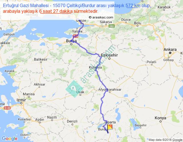 Ertuğrul Gazi Mahallesi - 15070 Çeltikçi Burdur arası yaklaşık olarak 90 km/h ile yukarıda belirtilen sürede olup, iki yerin kuş uçuşu uzaklığı (mesafesi) 391'dir. Eğer belirtilen yerler arasında uçak seferi var ise bu süre uçakla 36 dakika'ya kadar düşebilir. Yolculuk otobüsle 8 saat 23 dakika sürmektedir.