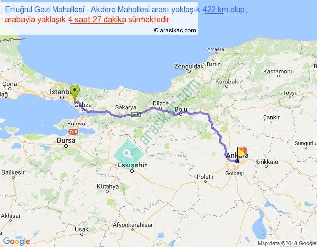 Ertuğrul Gazi Mahallesi - Akdere Mahallesi arası yaklaşık olarak 90 km/h ile yukarıda belirtilen sürede olup, iki yerin kuş uçuşu uzaklığı (mesafesi) 325'dir. Eğer belirtilen yerler arasında uçak seferi var ise bu süre uçakla 30 dakika'ya kadar düşebilir. Yolculuk otobüsle 5 saat 47 dakika sürmektedir.