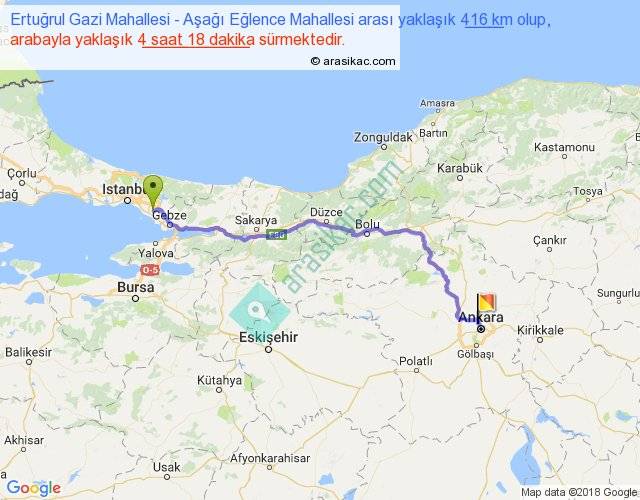 Ertuğrul Gazi Mahallesi - Aşağı Eğlence Mahallesi arası yaklaşık olarak 90 km/h ile yukarıda belirtilen sürede olup, iki yerin kuş uçuşu uzaklığı (mesafesi) 319'dir. Eğer belirtilen yerler arasında uçak seferi var ise bu süre uçakla 29 dakika'ya kadar düşebilir. Yolculuk otobüsle 5 saat 35 dakika sürmektedir.