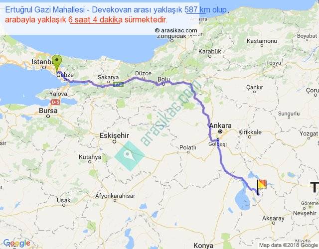 Ertuğrul Gazi Mahallesi - Devekovan arası yaklaşık olarak 90 km/h ile yukarıda belirtilen sürede olup, iki yerin kuş uçuşu uzaklığı (mesafesi) 440'dir. Eğer belirtilen yerler arasında uçak seferi var ise bu süre uçakla 40 dakika'ya kadar düşebilir. Yolculuk otobüsle 7 saat 53 dakika sürmektedir.