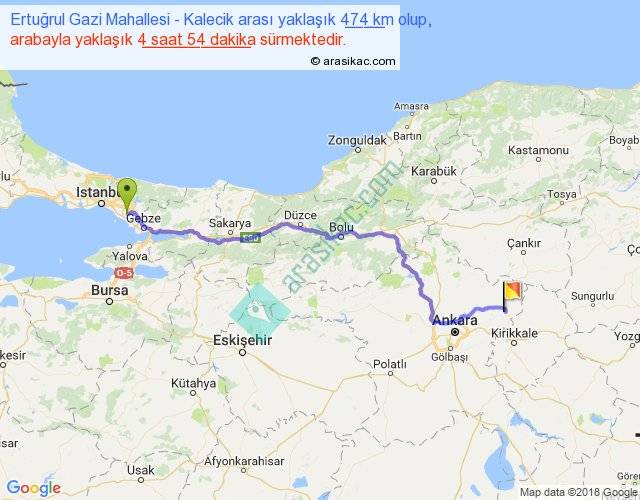 Ertuğrul Gazi Mahallesi - Kalecik arası yaklaşık olarak 90 km/h ile yukarıda belirtilen sürede olup, iki yerin kuş uçuşu uzaklığı (mesafesi) 361'dir. Eğer belirtilen yerler arasında uçak seferi var ise bu süre uçakla 33 dakika'ya kadar düşebilir. Yolculuk otobüsle 6 saat 22 dakika sürmektedir.