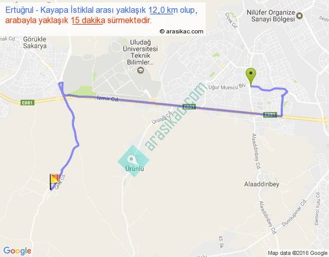 Ertuğrul - Kayapa İstiklal arası yaklaşık olarak 90 km/h ile yukarıda belirtilen sürede olup, iki yerin kuş uçuşu uzaklığı (mesafesi) 6'dir. Yolculuk otobüsle 19 dakika sürmektedir.