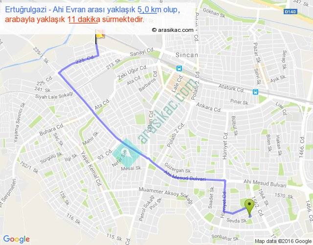 Ertuğrulgazi - Ahi Evran arası yaklaşık olarak 90 km/h ile yukarıda belirtilen sürede olup, iki yerin kuş uçuşu uzaklığı (mesafesi) 3'dir. Yolculuk otobüsle 14 dakika sürmektedir.