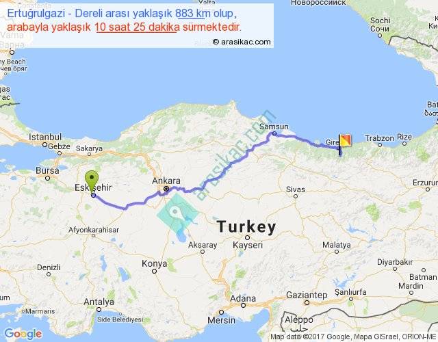 Ertuğrulgazi - Dereli arası yaklaşık olarak 90 km/h ile yukarıda belirtilen sürede olup, iki yerin kuş uçuşu uzaklığı (mesafesi) 680'dir. Eğer belirtilen yerler arasında uçak seferi var ise bu süre uçakla 1 saat 02 dakika'ya kadar düşebilir. Yolculuk otobüsle 13 saat 32 dakika sürmektedir.
