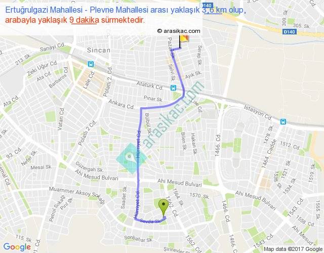 Ertuğrulgazi Mahallesi - Plevne Mahallesi arası yaklaşık olarak 90 km/h ile yukarıda belirtilen sürede olup, iki yerin kuş uçuşu uzaklığı (mesafesi) 2'dir. Yolculuk otobüsle 11 dakika sürmektedir.