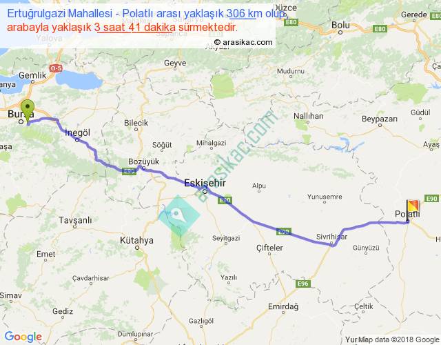 Ertuğrulgazi Mahallesi - Polatlı arası yaklaşık olarak 90 km/h ile yukarıda belirtilen sürede olup, iki yerin kuş uçuşu uzaklığı (mesafesi) 265'dir. Eğer belirtilen yerler arasında uçak seferi var ise bu süre uçakla 24 dakika'ya kadar düşebilir. Yolculuk otobüsle 4 saat 47 dakika sürmektedir.