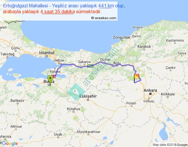Ertuğrulgazi Mahallesi - Yeşilöz arası yaklaşık olarak 90 km/h ile yukarıda belirtilen sürede olup, iki yerin kuş uçuşu uzaklığı (mesafesi) 266'dir. Eğer belirtilen yerler arasında uçak seferi var ise bu süre uçakla 24 dakika'ya kadar düşebilir. Yolculuk otobüsle 5 saat 57 dakika sürmektedir.