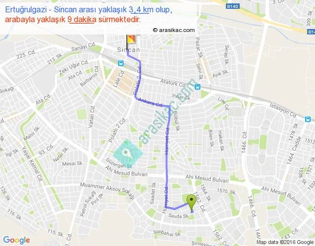 Ertuğrulgazi - Sincan arası yaklaşık olarak 90 km/h ile yukarıda belirtilen sürede olup, iki yerin kuş uçuşu uzaklığı (mesafesi) 3'dir. Yolculuk otobüsle 11 dakika sürmektedir.