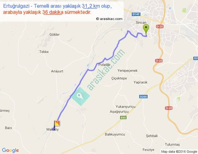 Ertuğrulgazi - Temelli arası yaklaşık olarak 90 km/h ile yukarıda belirtilen sürede olup, iki yerin kuş uçuşu uzaklığı (mesafesi) 25'dir. Yolculuk otobüsle 46 dakika sürmektedir.