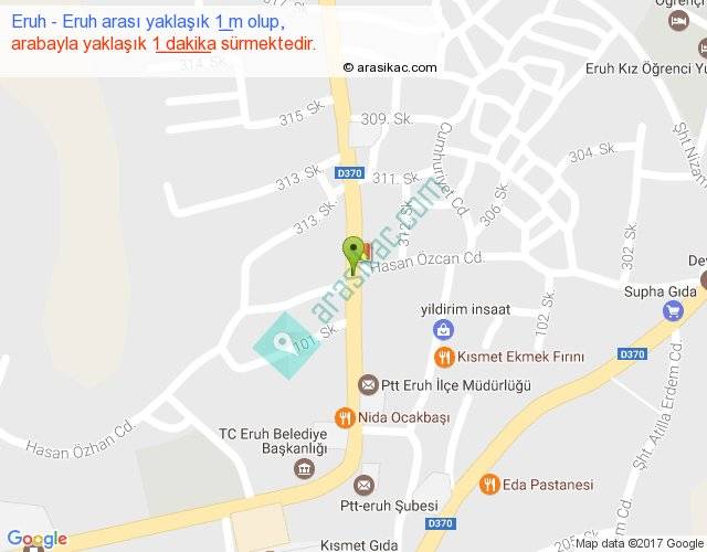 Eruh - Eruh arası yaklaşık olarak 90 km/h ile yukarıda belirtilen sürede olup, iki yerin kuş uçuşu uzaklığı (mesafesi) 0'dir. Yolculuk otobüsle 1 dakika sürmektedir.
