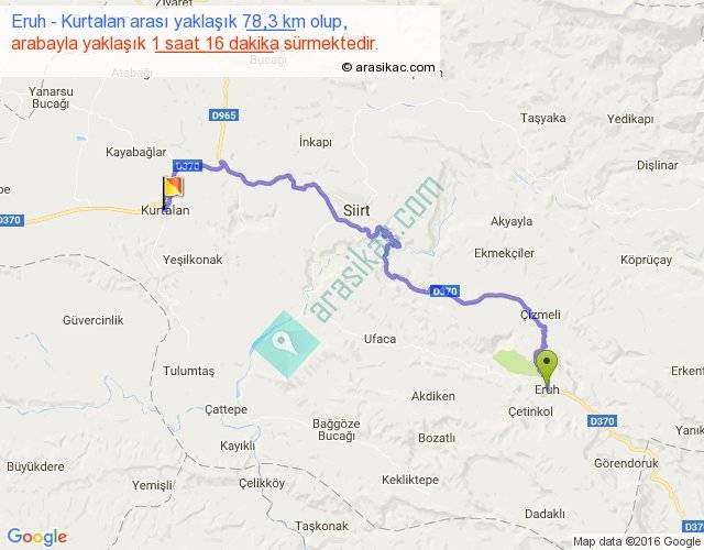 Eruh - Kurtalan arası yaklaşık olarak 90 km/h ile yukarıda belirtilen sürede olup, iki yerin kuş uçuşu uzaklığı (mesafesi) 46'dir. Yolculuk otobüsle 1 saat 38 dakika sürmektedir.