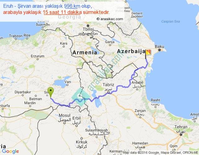 Eruh - Şirvan arası yaklaşık olarak 90 km/h ile yukarıda belirtilen sürede olup, iki yerin kuş uçuşu uzaklığı (mesafesi) 628'dir. Eğer belirtilen yerler arasında uçak seferi var ise bu süre uçakla 57 dakika'ya kadar düşebilir. Yolculuk otobüsle 19 saat 44 dakika sürmektedir.