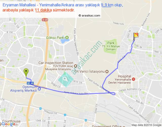 Eryaman Mahallesi - Yenimahalle Ankara arası yaklaşık olarak 90 km/h ile yukarıda belirtilen sürede olup, iki yerin kuş uçuşu uzaklığı (mesafesi) 7'dir. Yolculuk otobüsle 14 dakika sürmektedir.