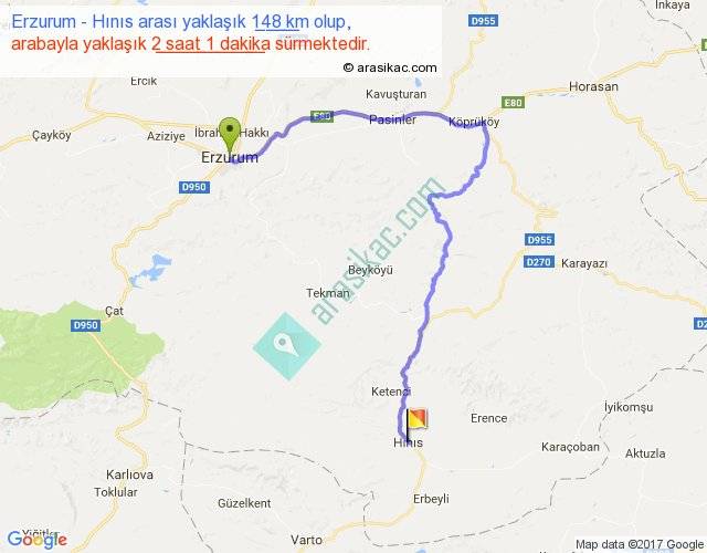 Erzurum - Hınıs arası yaklaşık olarak 90 km/h ile yukarıda belirtilen sürede olup, iki yerin kuş uçuşu uzaklığı (mesafesi) 71'dir. Yolculuk otobüsle 2 saat 34 dakika sürmektedir.